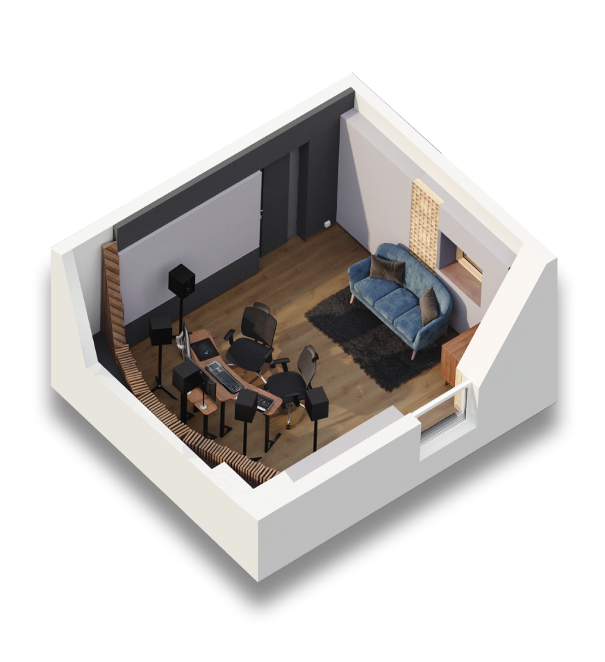 Ce studio est conçu pour le mixage 5.1 ou le montage son, c’est l’espace idéal pour créer des bandes originales mettant l’accent sur la narration et la pensée créative. Le studio est entièrement traité acoustiquement pour travailler de façon très détaillée et vous apportera un réel confort d’écoute. Une cabine speak est également disponible pour les prises de voix.